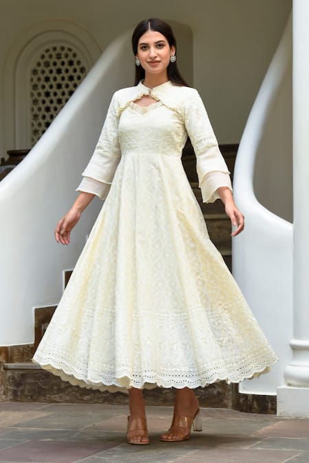 Off White Rayon Embroidery Open Neck Ruffle Detailed Neckline Dress