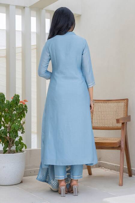 Blue straight kurta featuring mandarin neckline and gota patti work on cuffs. Paired with a matching pant and embroidered dupatta.