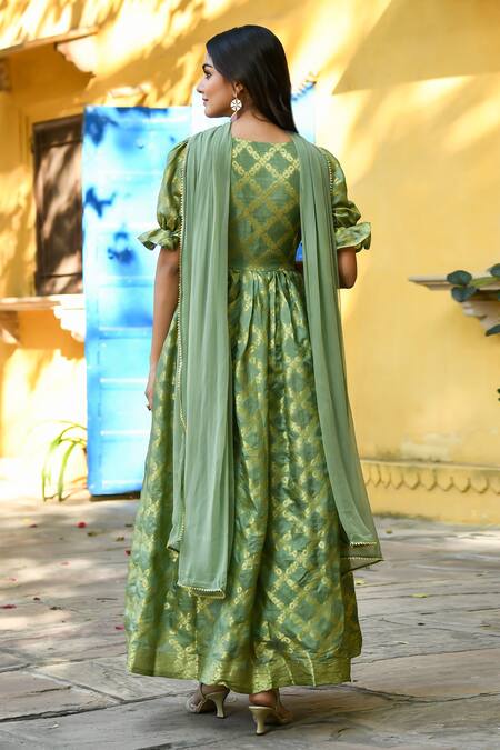 Buy_Suti Kapda_Green Silk Zari, Embroidery V-neck Woven Checkered Anarkali With Dupatta_at_Aza_Fashions