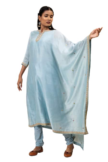 Sky blue kurta featuring notched neckline and three-quarter sleeves with embroidery details. Paired with a coordinating churidar and attached drape dupatta.