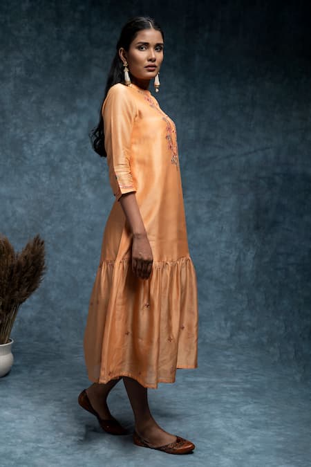 Orange Chanderi Silk Embroidery Floral Mandarin Tiered Dress