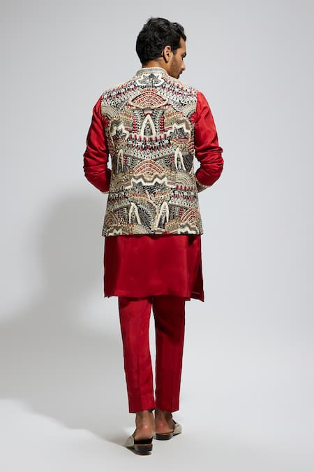 Intricate thread and sequin embroidery in abstract patterns., Mandarin collar design., Sleeveless bundi with rolled up sleeves.