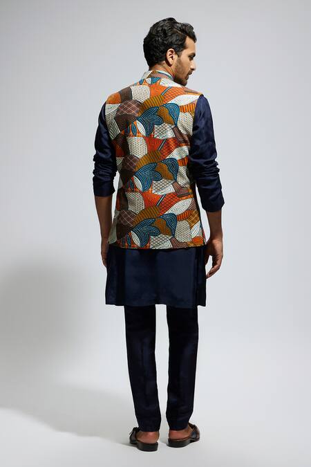 Multicolour abstract geometric patchwork, Mandarin collar design, Sleeveless bundi with full-sleeve kurta
