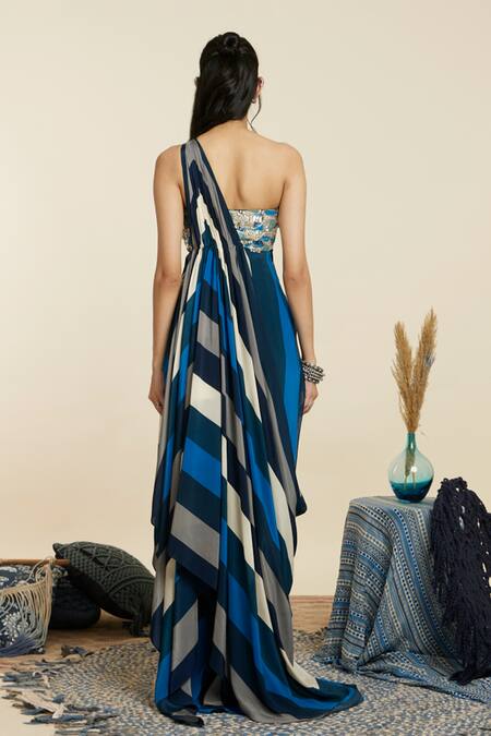 Buy_Sva By Sonam & Paras Modi_Blue Crepe Sequins, Embroidery Asymmetric Stripe Draped Saree Gown_Online_at_Aza_Fashions