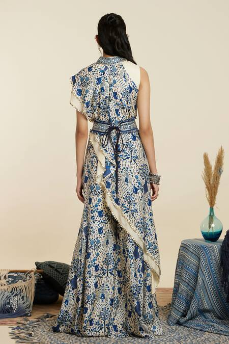 Blue Crepe Print Floral Asymmetric Neck Peacock And Tunic With Pant