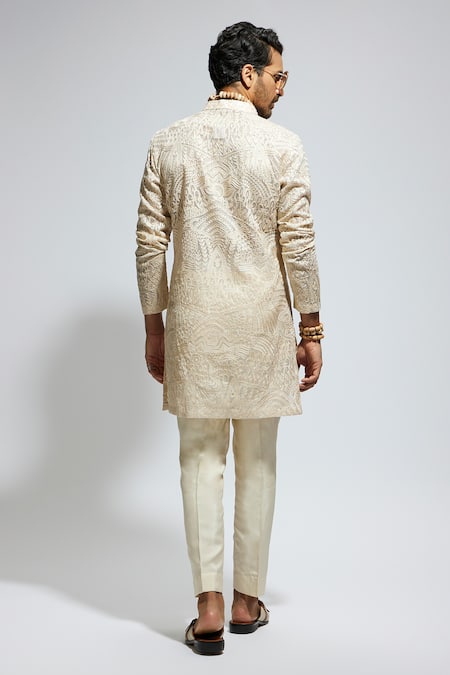 Beige kurta featuring resham embroidery in a floral pattern. Paired with matching pants for a complete look.