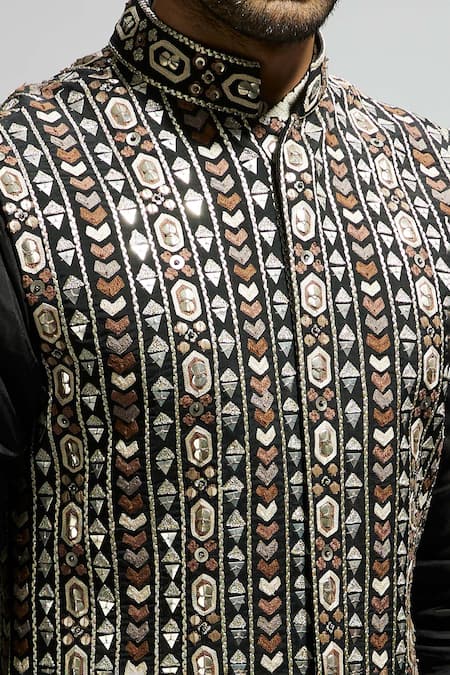 Intricate geo embroidery pattern, Band collar design, Sleeveless silhouette