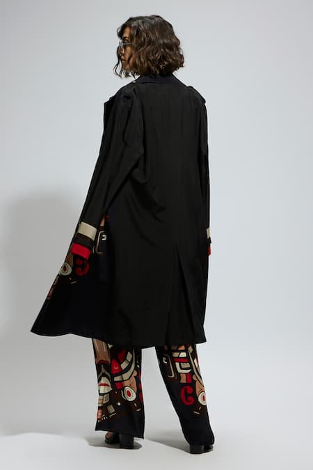 Black trench coat featuring a mask placement print and full sleeves