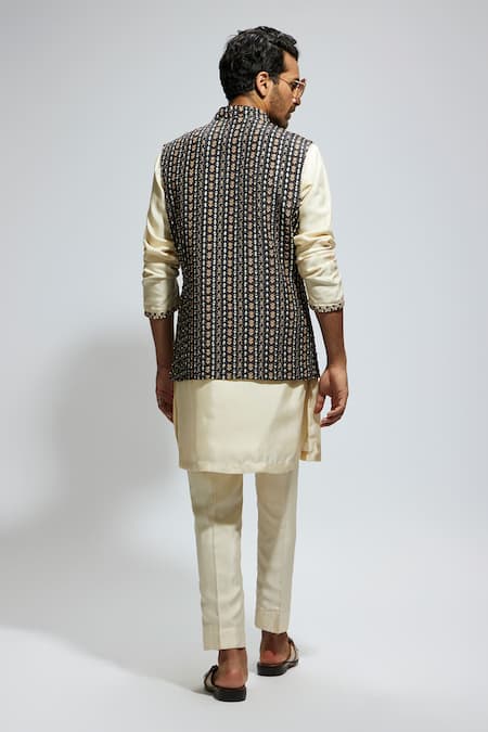 Black bundi featuring multicolour geometric boho stripe patterns, embellished with sequin and cutdana. Paired with a white kurta and pant.