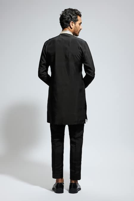 Black silk kurta featuring a thread and sequin embroidered yoke with a mandarin collar. Paired with matching pants for a complete look.