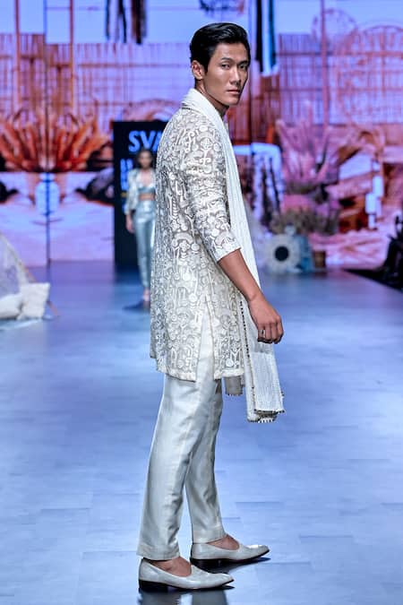 Ivory kurta featuring full sleeves, mandarin collar, and all-over bloom garden thread work embroidery. Paired with solid pants and an embroidered dupatta with dangling sequin borders.