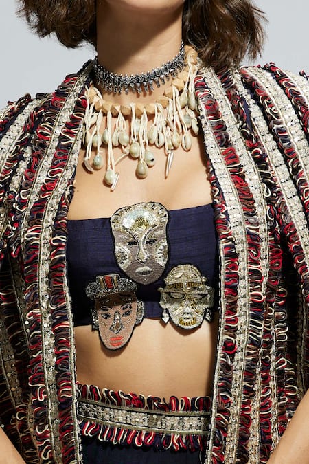 Blue Silk Metallic Thread Open Neck Embellished Jacket