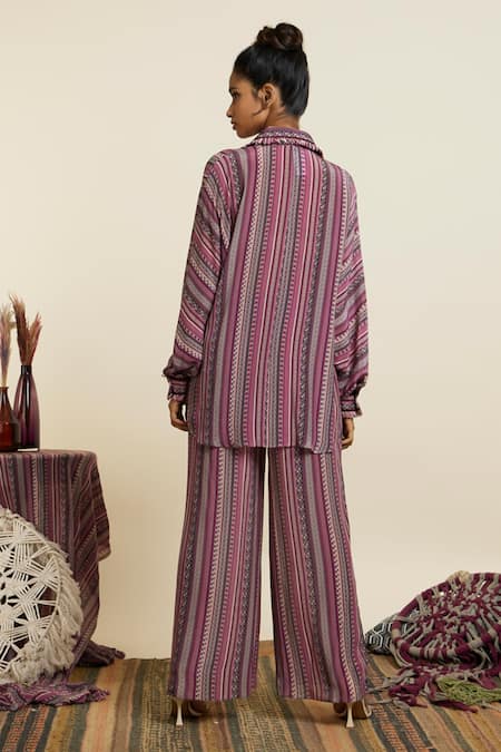 Buy_Sva By Sonam & Paras Modi_Purple Crepe Print Boho Stripe Collar Shirt And Pant Set_Online_at_Aza_Fashions