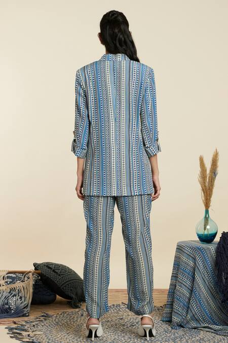Multi Color Crepe Printed Boho Stripe Notched Lapel Collar Blazer And Pant Set
