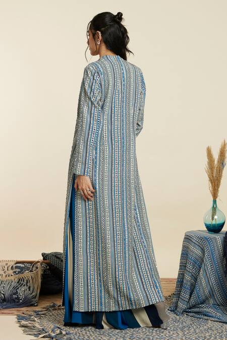 Blue full sleeves jacket featuring a mandarin collar with boho striped print and sequin embellishments. Paired with a striped bustier and multi-striped flared pant.