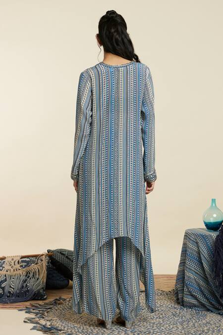 Blue tunic featuring a V neck, full sleeves, and a front tie-up detail. Paired with matching palazzo, both adorned with boho striped patterns and embroidered neckline & cuffs.