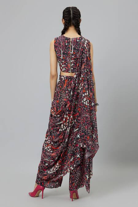 Gray Round Neck Draped Jungle Print Crop Top And Pant Set