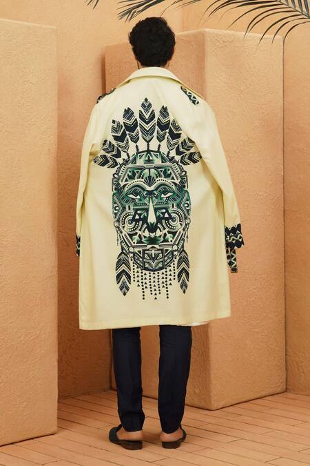 Ivory trench coat made from crepe fabric featuring intricate designs.