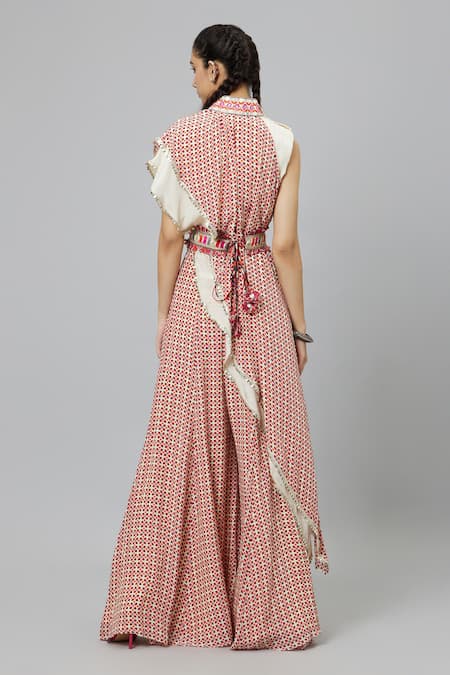 Multi color drape crop top featuring geometric prints and embellishments detailing. Paired with a printed sharara showcasing a blend of woven patterns.