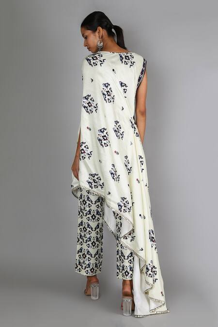 Off white draped kurta with geometric bird print, draped sleeve & lace border. Paired with damask printed straight pant.