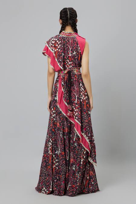 Grey Crepe Printed Jungle Band Collar Draped Layered Crop Top And Sharara Set