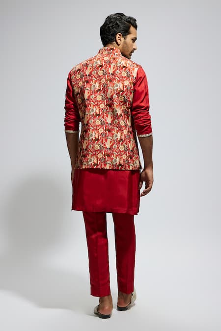 Orange embellished bundi featuring floral-fauna prints with sequin and stud details. Paired with a matching kurta and pant.