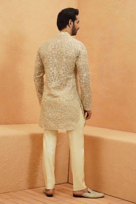 Ivory kurta featuring sheer organza fabric with intricate embellishments. Paired with matching ivory pants for a complete look.