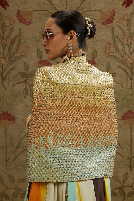 Multicolored jacket featuring bead embellishment with slit sleeves. Paired with a striped print bustier and a draped embellished skirt.