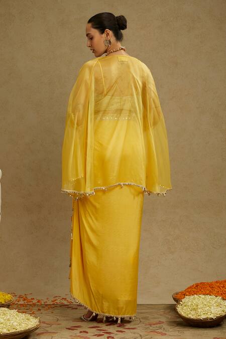 Yellow Silk, Organza Beads, Embroidery Sweetheart Neck Cape Draped Skirt Set