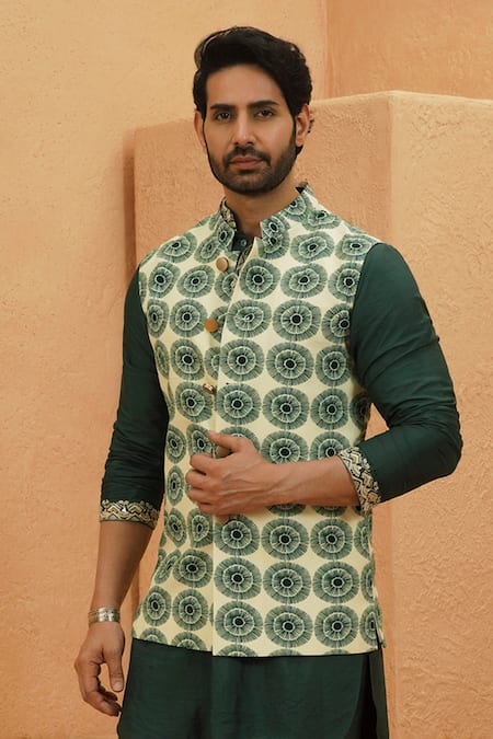 Unique print design on the bundi, High collar with button closure, Stylish side slits for ease of movement