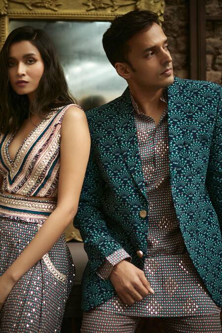 Blue silk blazer with feather print. Paired with floral print short kurta & pant.