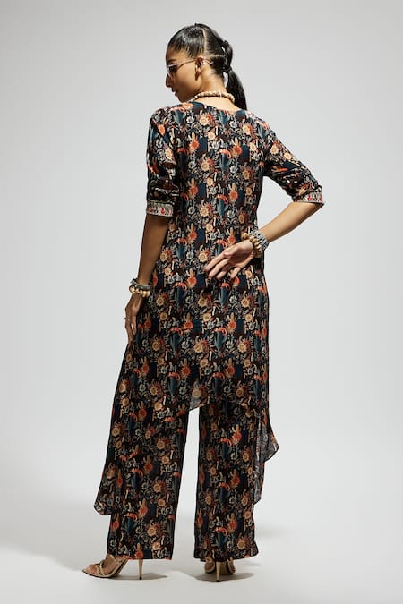 Black asymmetric hem tunic featuring floral bloom prints with embellished cuffs and neckline. Paired with coordinating pants for a complete look.