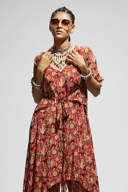 Orange asymmetric hem tunic featuring floral bloom prints, embellished cuffs and neckline with a front tie-up. Paired with coordinating pants for a complete look.