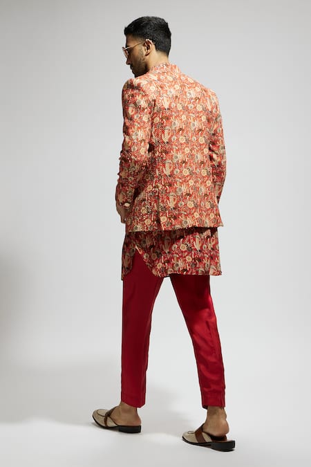 Orange bandhgala featuring floral jaal print with thread and sequin embroidery. Paired with a floral print kurta and pant.