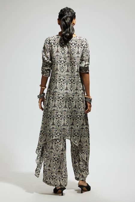 White asymmetric hem tunic featuring abstract floral jaal prints with embellished cuffs and neckline, elevated with a front tie-up. Paired with coordinating pant for a complete look.