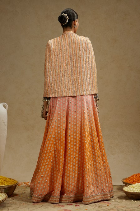 Orange ombre lehenga featuring floral print and bead embellishments. Paired with a sleeveless bustier and an open cape jacket.