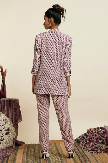 Multi Color Crepe Printed Geometric Shawl Collar Blazer And Pant Set