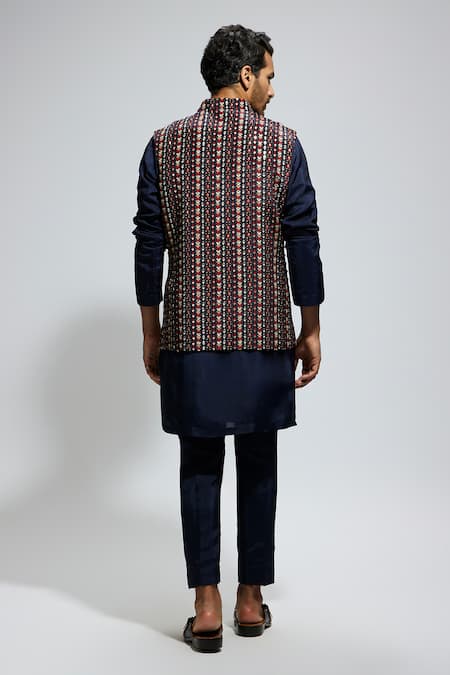 Blue bundi featuring geometric print and metallic stud embellishments. Paired with a solid kurta and pant.