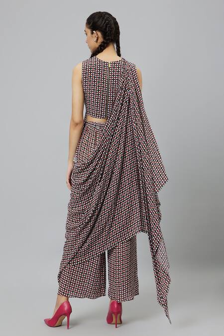 Black Crepe Round Neck Geometric Print Draped Crop Top And Pant Set