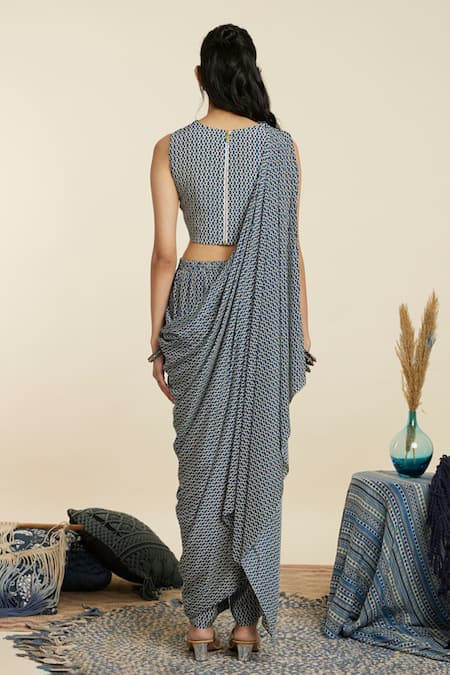 Blue crop top featuring a cowl neck and geometric prints, paired with matching pants. The set includes asymmetric saree drapes and a back elasticated pant for added comfort.