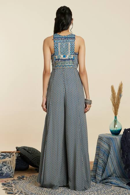 Blue sleeveless jumpsuit featuring a halter neck and geometric print with sequin applique, thread, and cutdana embellishments on the yoke