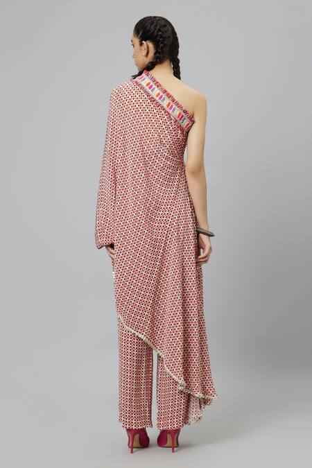 Ivory one shoulder draped kurta featuring geometric prints and embellishments detailing. Paired with printed pant for a complete look.