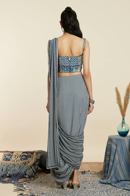 Blue pre-draped saree featuring geometric print and embroidered border. Accompanied by a crop top adorned with thread, sequin applique, and cutdana embellishments.