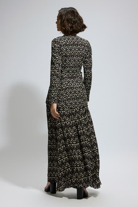 Black jacket featuring side cutouts, geometric print, and sequin and bead embellishments. Paired with a printed flared pant for a complete look.