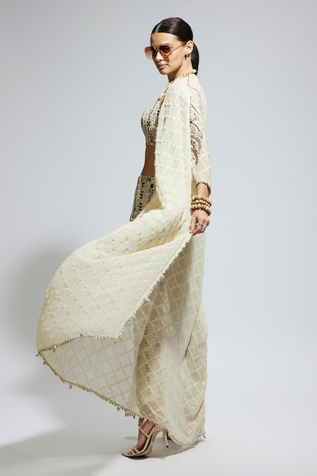 White Silk Mirrors, Sequins, Beads Round Neck Geometric Woven Cape Pant Set