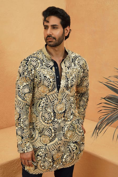 Midnight blue kurta featuring heavy embellishments and a traditional collar. Paired with matching pants in crepe fabric.