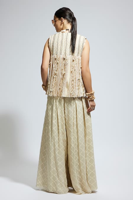 Ivory sleeveless jacket featuring boho threadwork and braided fringe detailing