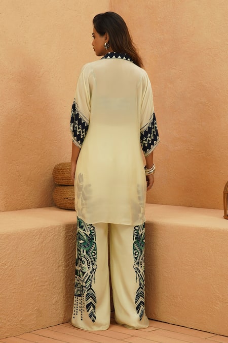Ivory Crepe Beads Round Neck, Collared Printed Top And Pant Set