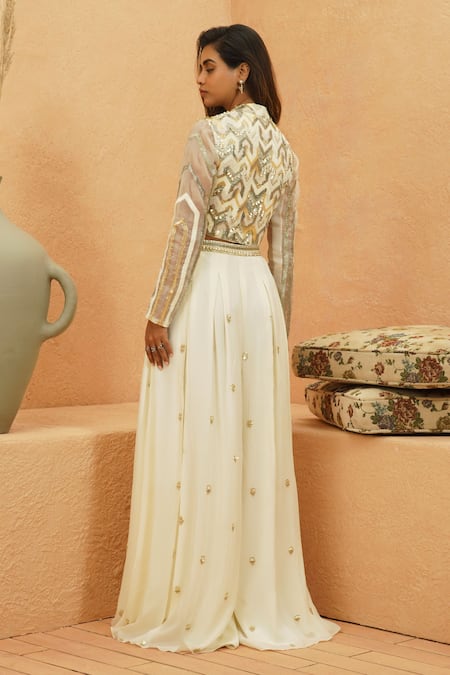 Ivory silk jacket featuring intricate embroidery and a cropped design. Paired with a matching flared pant adorned with embellishments.