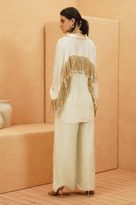 Ivory Silk Tassels Collared Top And Pant Co-ord Set